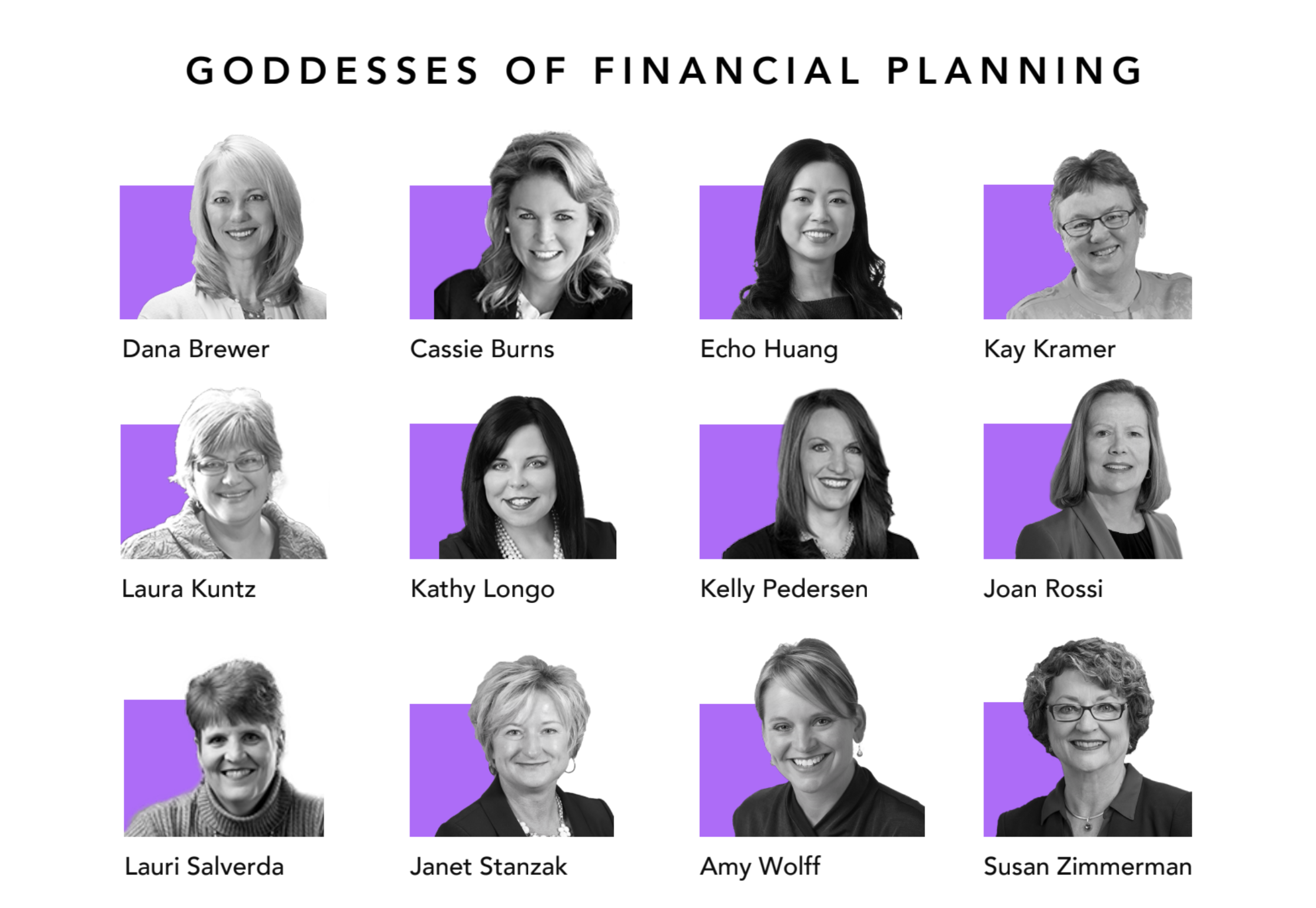 Members of the Goddesses of Financial Planning include Dana Brewer and Kay Kramer of Birchwood Financial Partners, Cassidy Burns of WR Baird, Ellen Dubuque and Joan Rossi of Rossi Dubuque Breckenridge LLC, Echo Huang of Echo Wealth Management, Laura Kuntz of Laurel Wealth Planning, Kathy Longo of Flourish Wealth Management, Kelly Olson Pedersen of Caissa Wealth Strategies, Lauri Salverda of Castle Rock Financial Planning, Janet Stanzak of Financial Empowerment, Amy Jensen Wolf of AJW Financial, and Susan Zimmerman of Mindful Asset Planning. A photo of the group is available for download here.